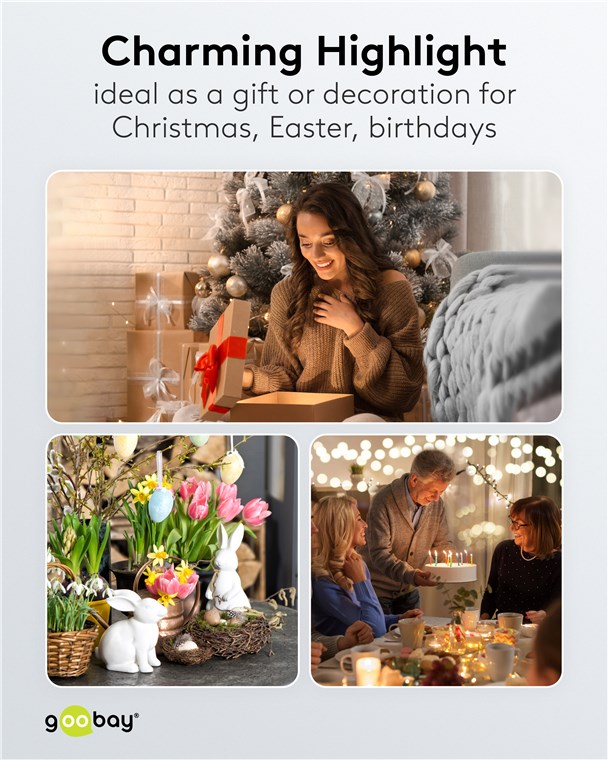 - The integrated battery-operated string light with micro LEDs (5 m) perfectly complements your decoration on occasions such as Christmas, a birthday or Easter.