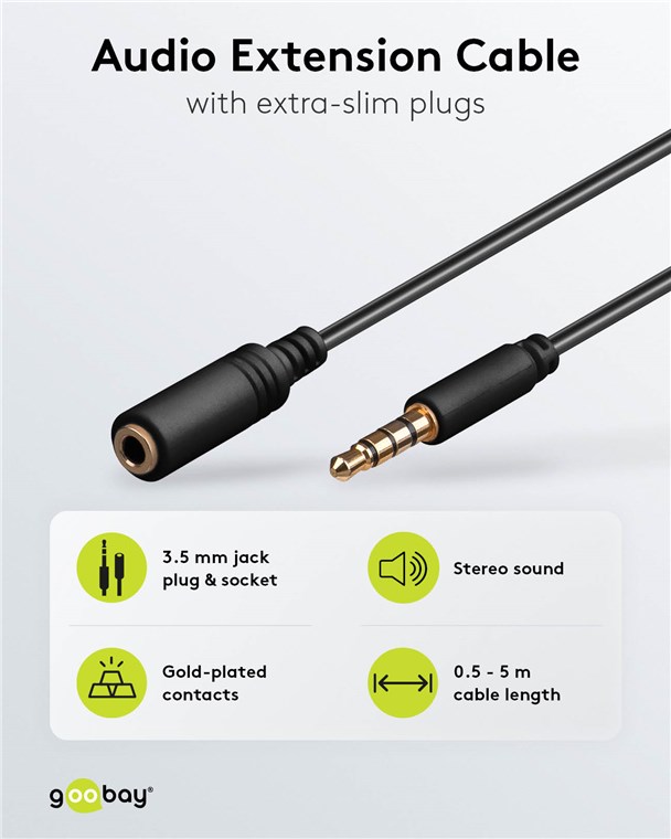 - For extending audio cables with 3.5 mm jack plugs that are used for stereo headphones with microphone.