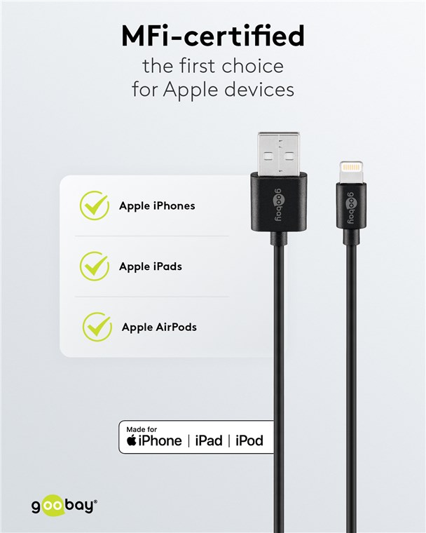 • The charging cable with Lightning plug charges iOS devices such as Apple iPhone, iPad, iPod or AirPod models (Apple MFi certification)