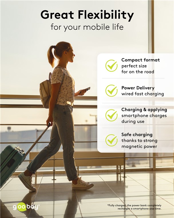 With maximum magnetic force, the mini power bank attaches to the smartphone - like a small backpack that is so compact that it provides perfect access to the camera. Thanks to the strong adhesion and the ultra-small format, the power bank remains docked to the mobile phone even when making a call or taking a picture, making it perfect for mobile charging - anywhere and anytime.