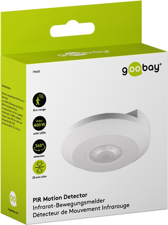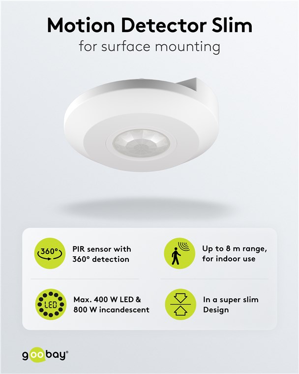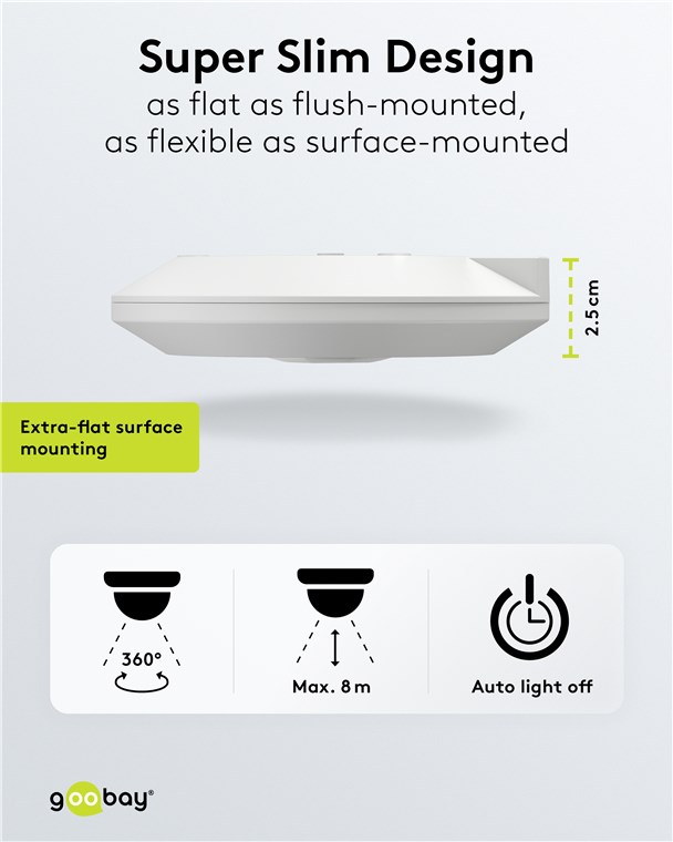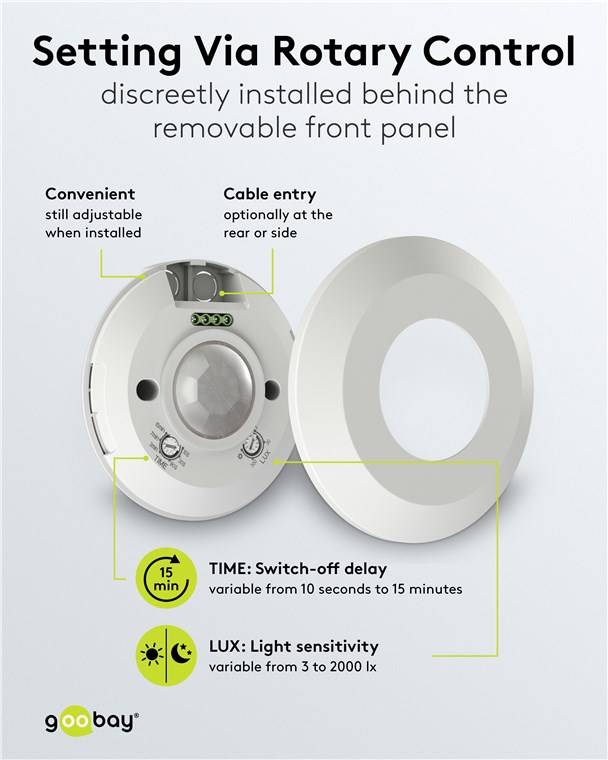 Would you like a surface-mounted solution, but don't want a bulky device on the ceiling? No problem, this motion detector is a sensational 25 mm flat and therefore very discreet. It is extremely easy to operate: The white cover conceals the rotary controls, which you can use to adjust the light sensitivity and switch-off delay – even after installation. This gives the device the clear edge over flush-mounted models.