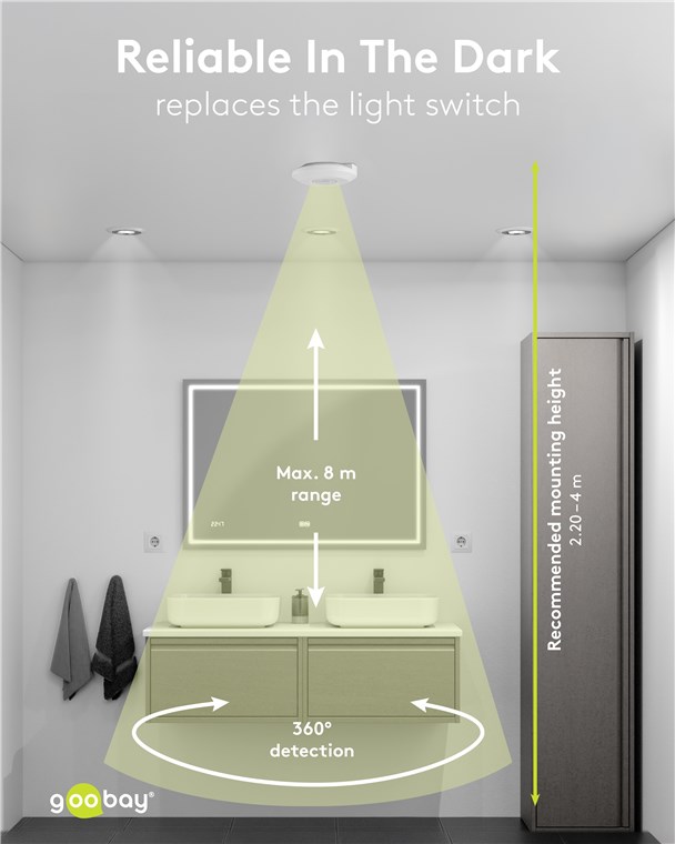 - Replaces the light switch and switches without contact: particularly practical in rooms where you enter with your hands full, e.g. hallways or utility rooms