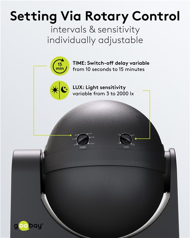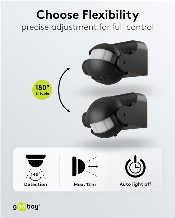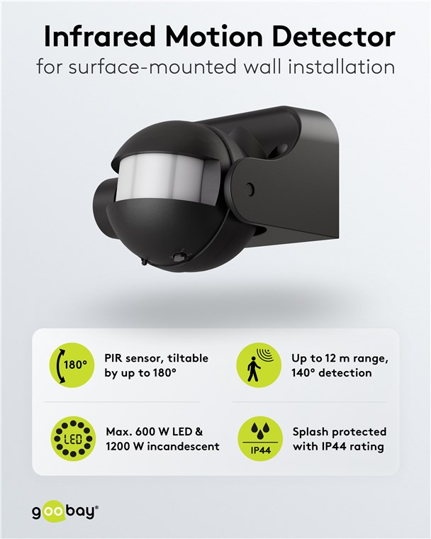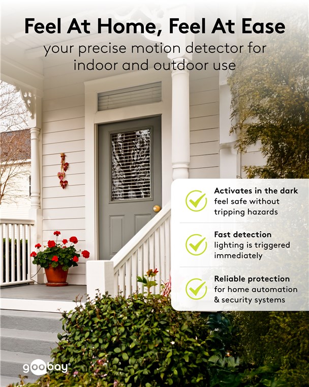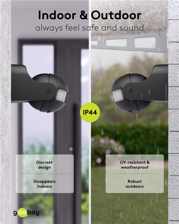 Wind and weather? No problem, the motion detector is IP44-rated, making it perfect for outdoor areas such as gardens, carports or house entrances. Simply connect it to path or outdoor lighting to avoid tripping hazards at dusk and in the dark. Motion detectors from Goobay – always feel safe and sound.
