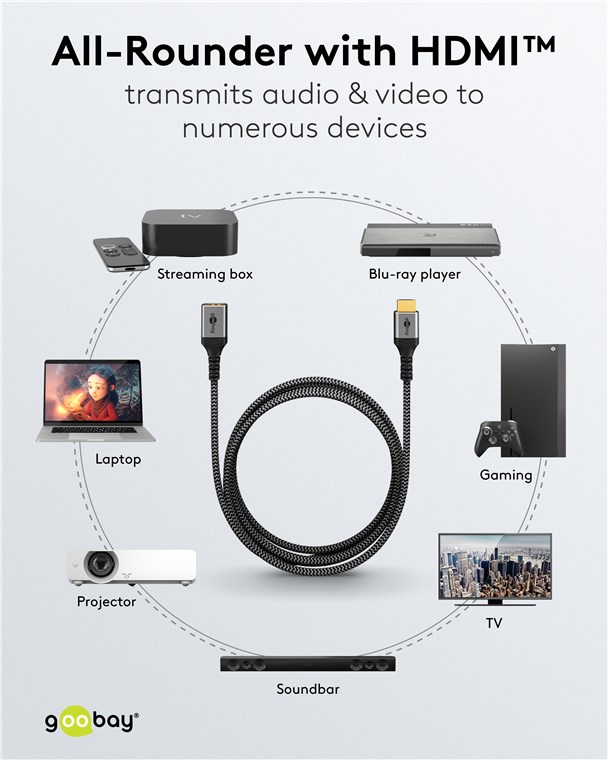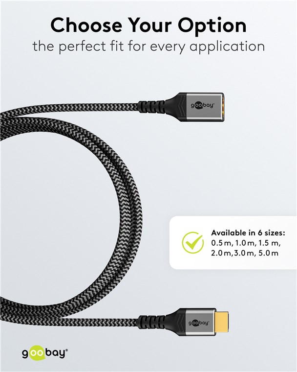 The Goobay Plus Series comes in a slim, elegant metal design in Sharkskin Grey. Use the cable to extend existing HDMI™ cables that are too short or connections that are difficult to access: Ideal for your smart TV stick if you can't mount it behind the TV or the mains power is too far away. With ultra-speed and full 8K UHD power, brilliant pictures and captivating home entertainment are guaranteed.