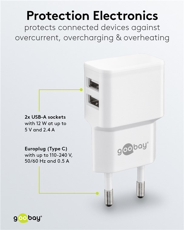 - The integrated protection electronics of the USB charger protects connected devices against overcurrent, overcharging and overheating