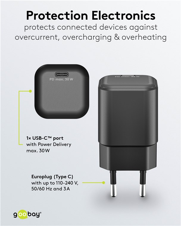 - The integrated protection electronics of the USB-C™ charger protects connected devices against overcurrent, overcharging and overheating