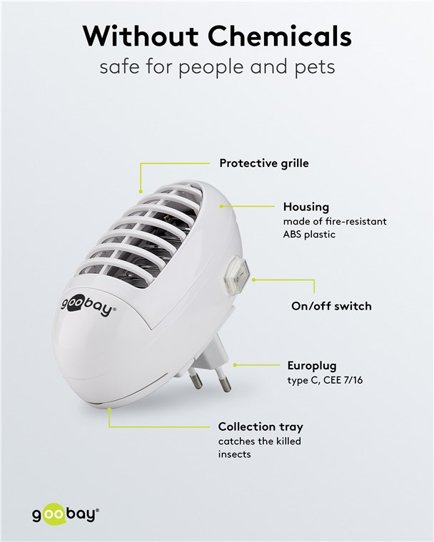 • The plug-in insect killer is operated without chemicals and therefore non-toxic and eco-friendly