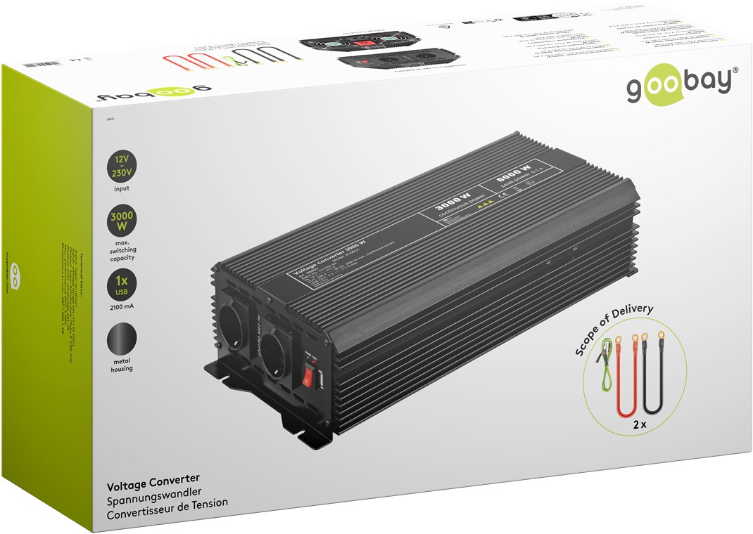 - The 12 V inverter can handle a total consumption power of 3000 W and absorbs power peaks up to 6000 W in only 0.1 s.