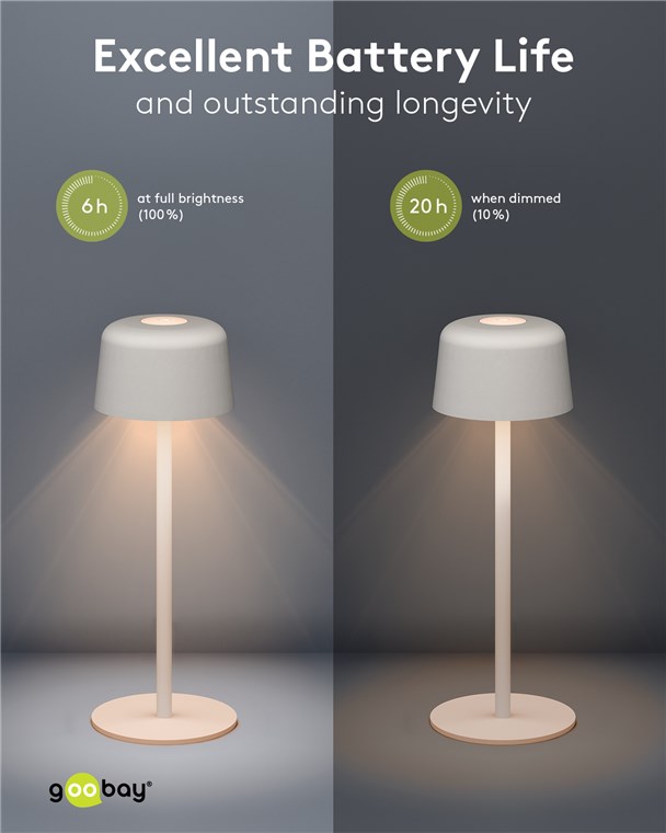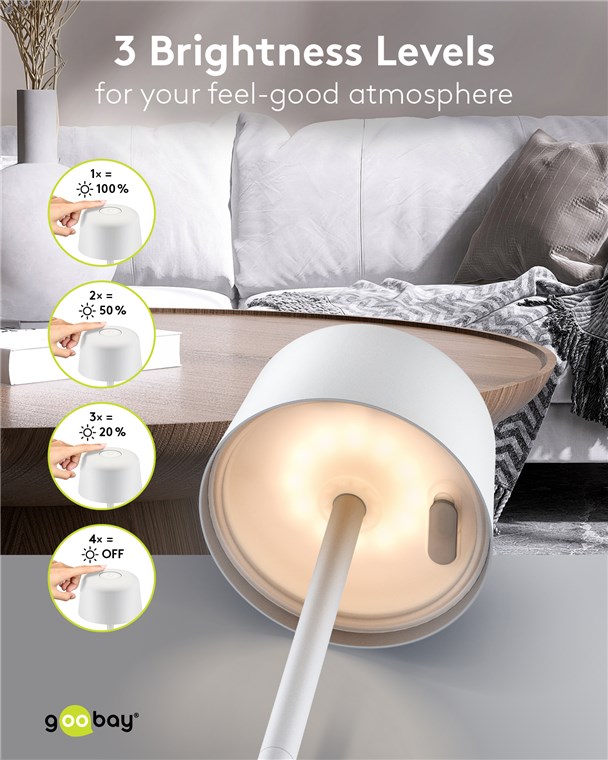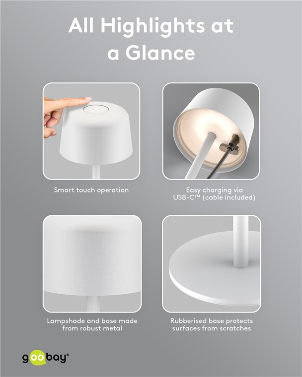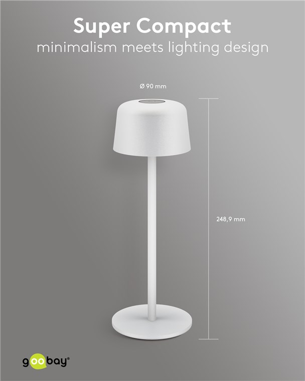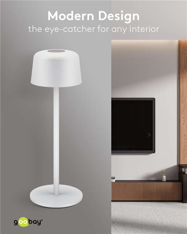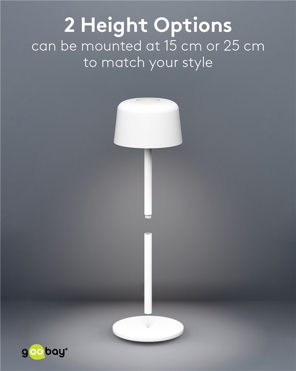 With its minimalist, Scandinavian design, the small table lamp refines any living room, bedroom or dining room and makes a style statement at every garden party. Made from high-quality, solid metal, the innovative Goobay light stands for quality and durability.