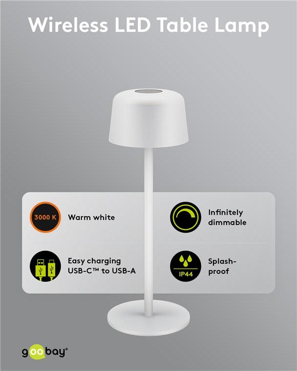 - Thanks to its splash water protection (protection class IP44), the table lamp is also perfect for the patio, balcony or garden
