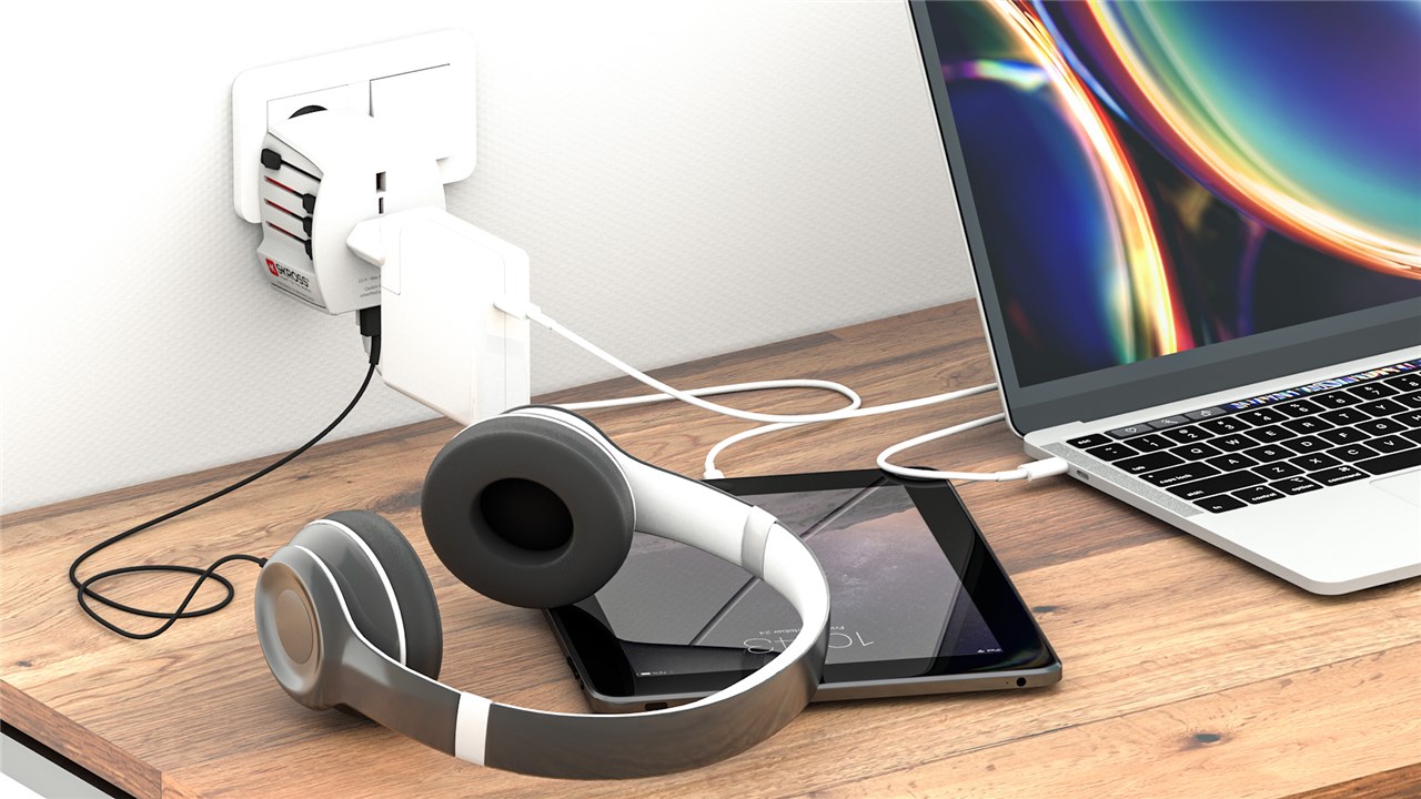 The compact and versatile World Adapter MUV USB (AC) from SKROSS® provides a safe connection to the grid of all unearthed 2-pin devices in over 220 destinations. Use the adapter to simultaneously charge 1x USB-C™ and 1x conventional USB device.