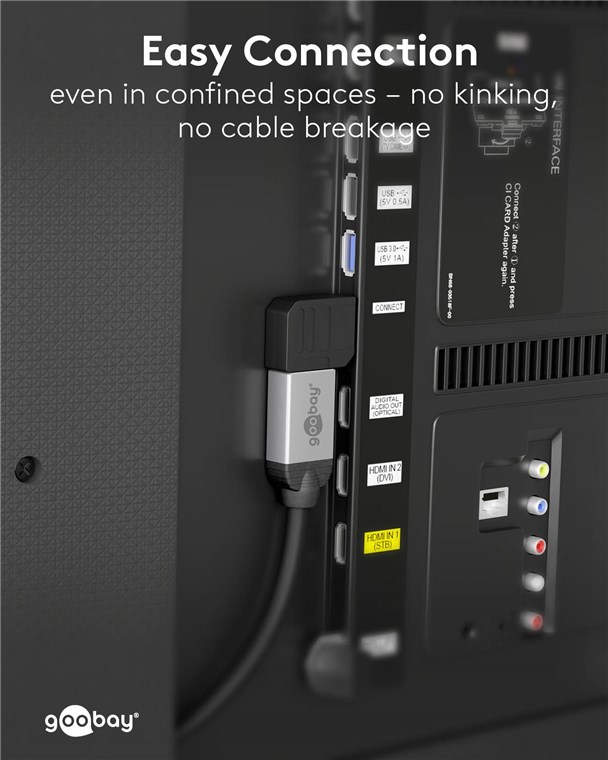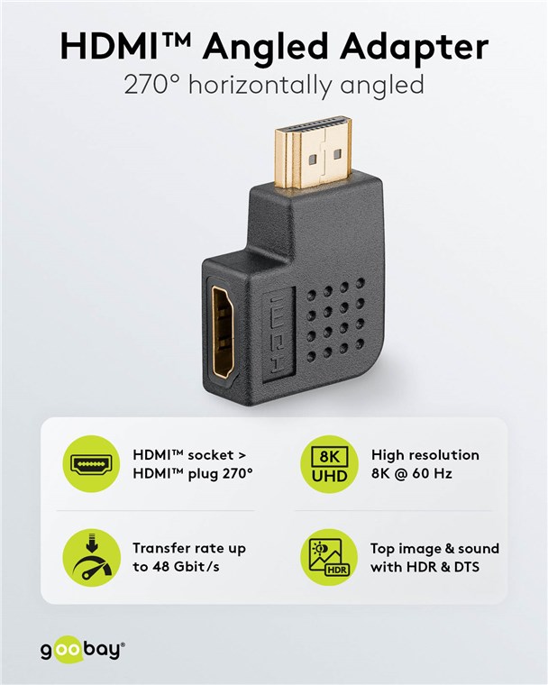 L'adaptateur coudé est la solution pratique pour raccorder un câble HDMI™ dans les espaces les plus étroits, p. ex. à l'arrière d'un téléviseur ou sur le côté d'un ordinateur portable. Grâce à l'angle de la fiche, le câble est bien placé contre l'appareil et évite ainsi efficacement qu'il ne se plie ou ne se rompe.