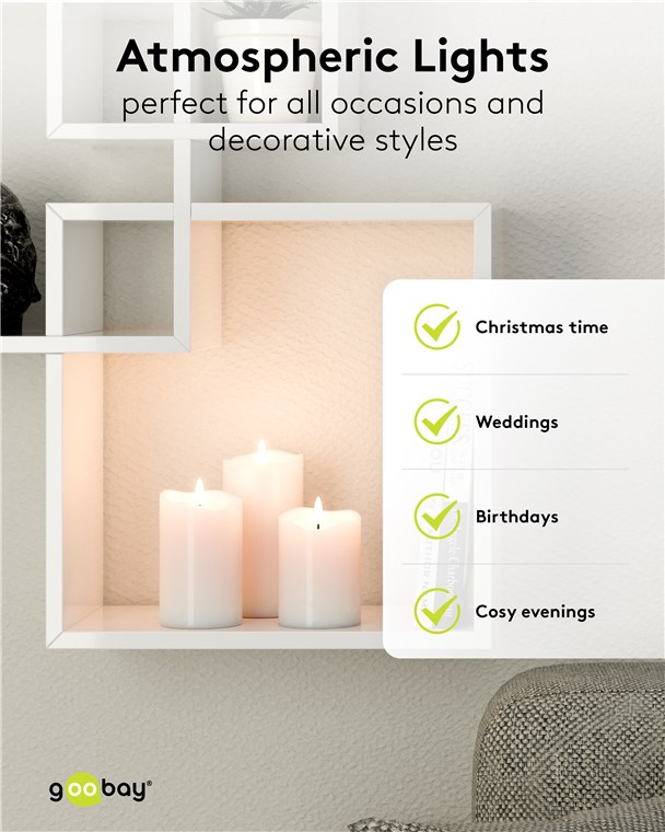 - Les lampes LED constituent une solution d'éclairage sûre sans risque d'incendie pour les personnes et les animaux – convient à tous les endroits où les vraies bougies sont trop dangereuses ou interdites