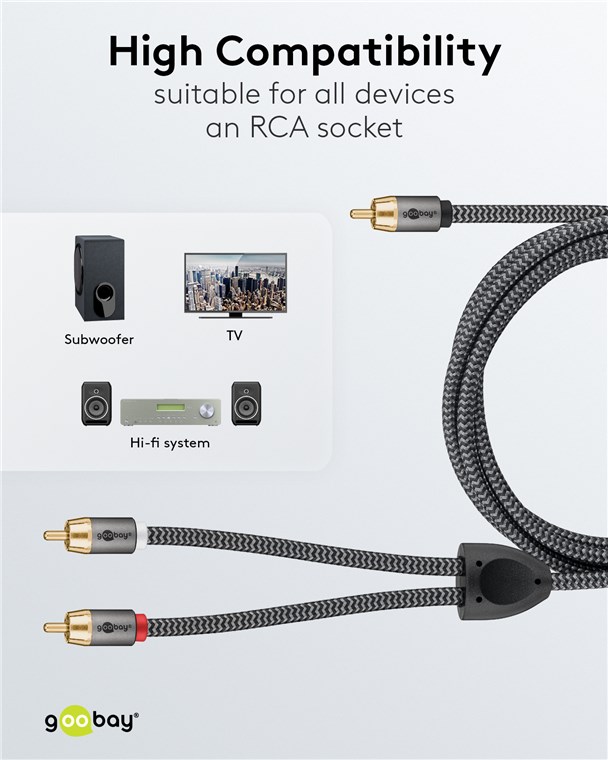 La série Plus de Goobay avec des connecteurs au design métallique fin et élégant en Sharkskin Grey. Le câble est spécialement conçu pour les signaux analogiques basse fréquence des subwoofers - pour une reproduction riche et puissante des basses pour une expérience musicale et cinématographique impressionnante.