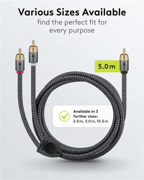- Avec 5 m, le câble audio a la longueur appropriée pour placer confortablement un subwoofer à l'endroit idéal dans la pièce