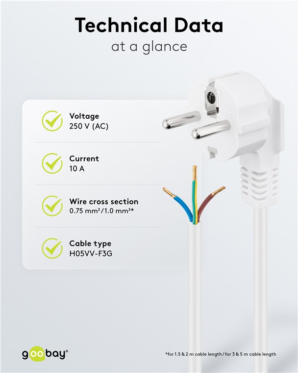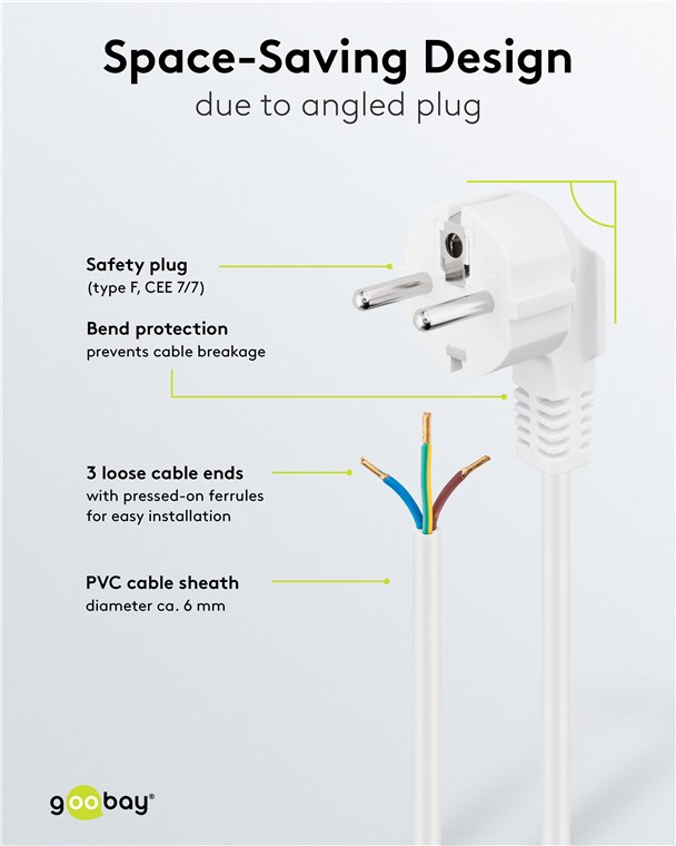 - Câble de raccordement avec fiche (coudée) pour le raccordement aux appareils électriques