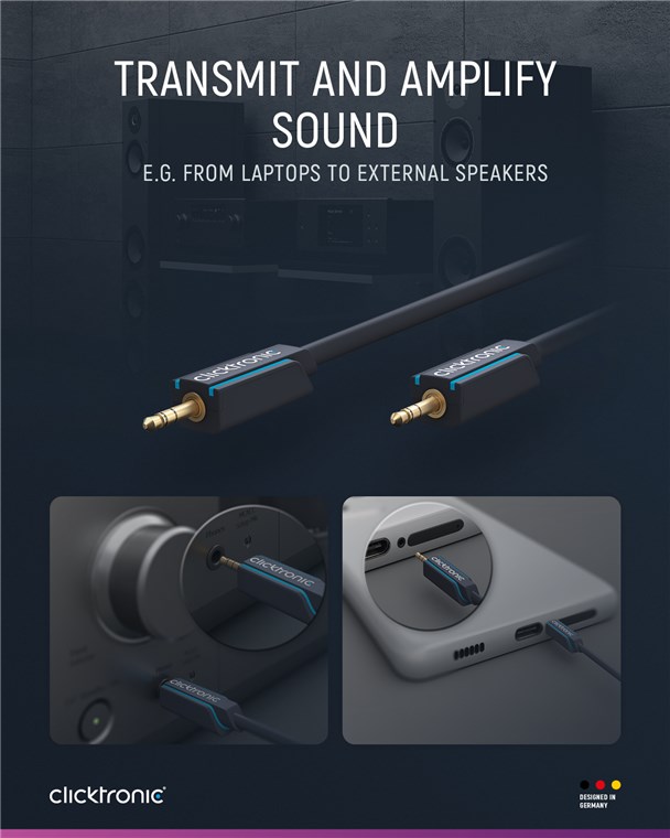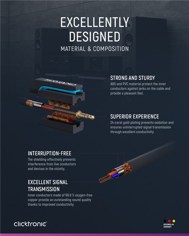 Clicktronic accorde une grande importance à la durabilité et à la stabilité. Notre promesse de qualité : 10 ans de garantie sur nos câbles jack. La structure de la fiche en trois parties, composée de composants en PVC et ABS, compense une traction brusque sur le câble, ce qui le protège idéalement contre les ruptures de câble. Les contacts plaqués or de haute qualité et les conducteurs en cuivre pur transmettent les signaux audio avec une qualité sonore maximale pour une expérience sonore parfaite. La construction robuste de nos câbles audio, propre à la marque, garantit ainsi un divertissement à domicile durable.