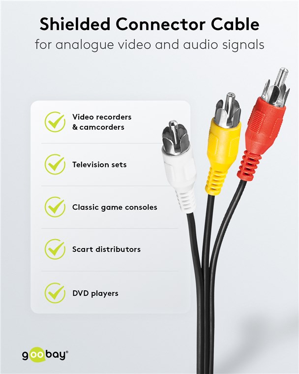 - Câble RCA pour la transmission de signaux vidéo et audio (1x vidéo, 2x audio L/R)