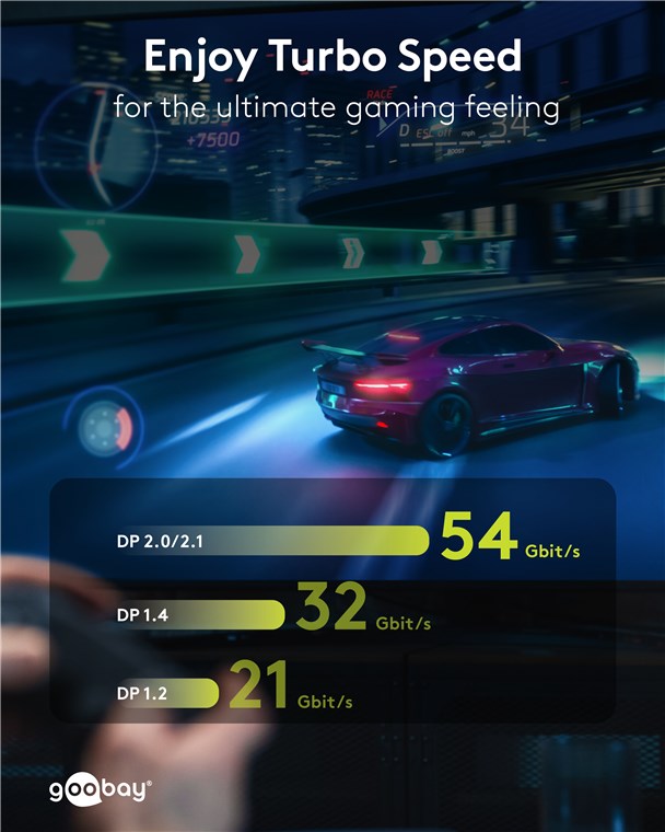 - Le câble de moniteur pour une transmission de signal haute résolution jusqu'à 8K @ 144 Hz ou 4K @ 240 Hz ainsi qu'un débit de données jusqu'à 54 Gbit/s