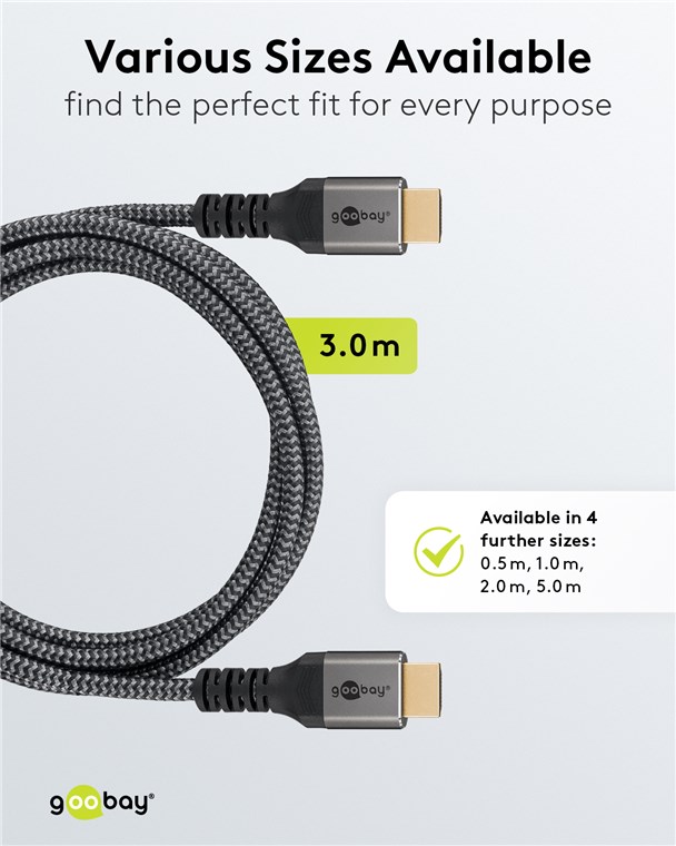 La série Plus de Goobay avec des connecteurs au design métallique fin et élégant en Sharkskin Grey. Le câble HDMI™ ultramoderne atteint des valeurs de pointe en termes de résolution et de vitesse de transmission et est également parfaitement adapté aux fonctions exigeantes comme ARC, HDR et les contenus 3D.