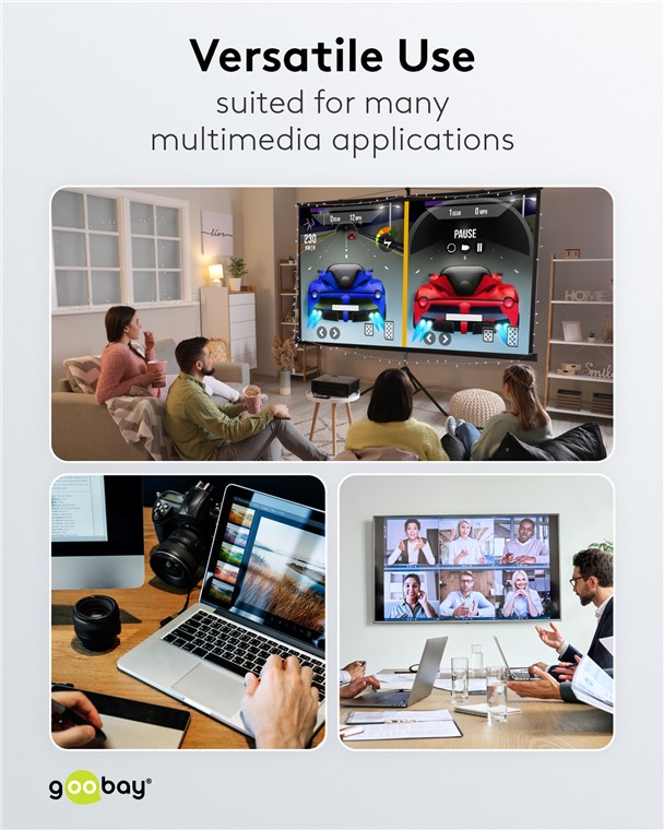 - Convient universellement à de nombreuses applications multimédia, p. ex. la projection de jeux, de consoles de jeux comme la PlayStation 5 ou la Xbox, Fire TV, Apple TV, d'ordinateurs portables et de lecteurs Blu-ray
