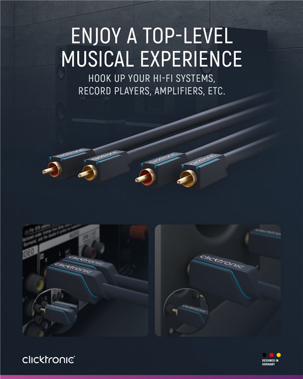 Clicktronic accorde une grande importance à la longévité et à la stabilité. Notre promesse de qualité : 10 ans de garantie sur nos câbles RCA. La structure de la fiche en trois parties, faite de composants en PVC et ABS, compense une traction brusque sur le câble, ce qui le protège idéalement contre les ruptures de câble. Des contacts plaqués or de haute qualité et des conducteurs en cuivre pur transmettent des signaux stéréo avec une qualité sonore maximale pour une expérience sonore parfaite. La construction robuste de nos câbles audio, propre à la marque, garantit ainsi un divertissement à domicile durable.
