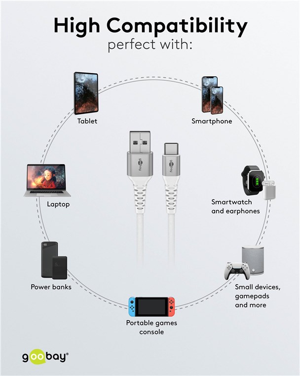 - Câble de charge et de données robuste avec une gaine en silicone revêtue de textile pour une flexibilité maximale et une protection absolue contre la rupture du câble