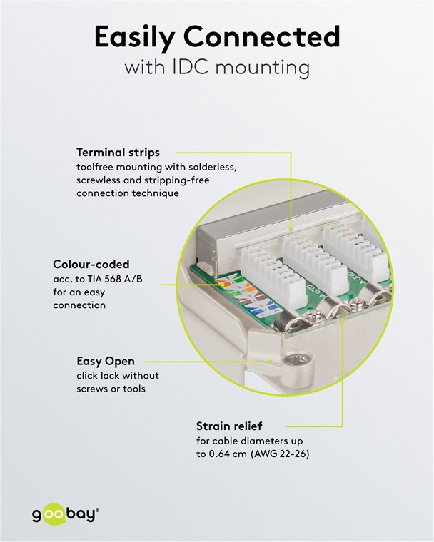 - Barrettes de connexion avec marquage couleur selon TIA 568 A/B pour une connexion simple et correcte
