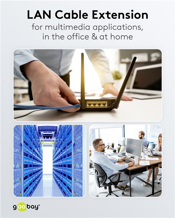 Nos câbles CAT transmettent des signaux avec une qualité maximale à une vitesse extrême et assurent une connexion stable. Nos câbles de connexion et nos connecteurs se caractérisent par des conducteurs internes de haute qualité, une gaine de câble robuste et des connecteurs parfaitement adaptés. Goobay a toujours le bon produit pour votre application réseau - aussi bien pour le réseau domestique que pour le réseau d'entreprise. Simplement. Tout. Ce qu'il vous faut!