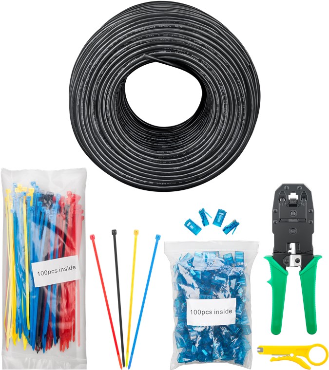 • Set de câbles Internet comprenant 1x câble LAN CAT 6A, 1x pince à sertir, 100x attaches-câbles de couleur et 100x connecteurs RJ45.