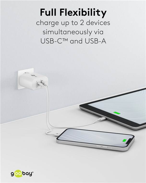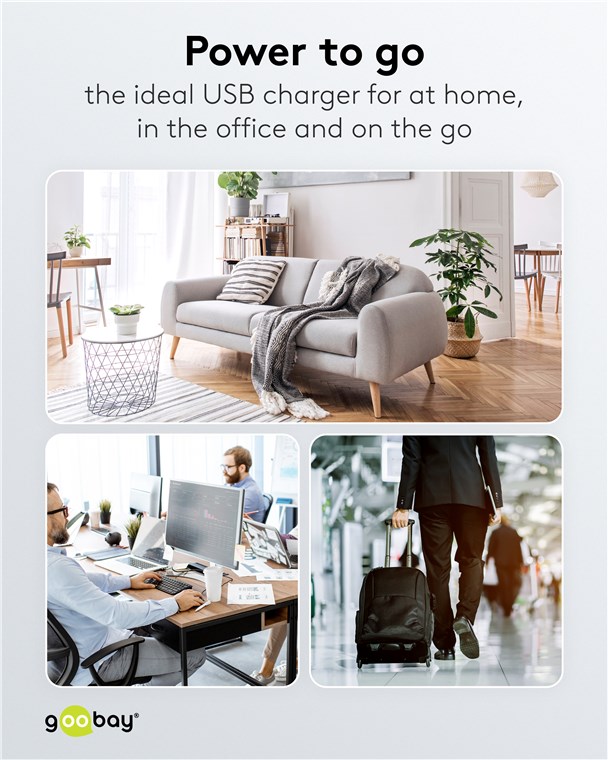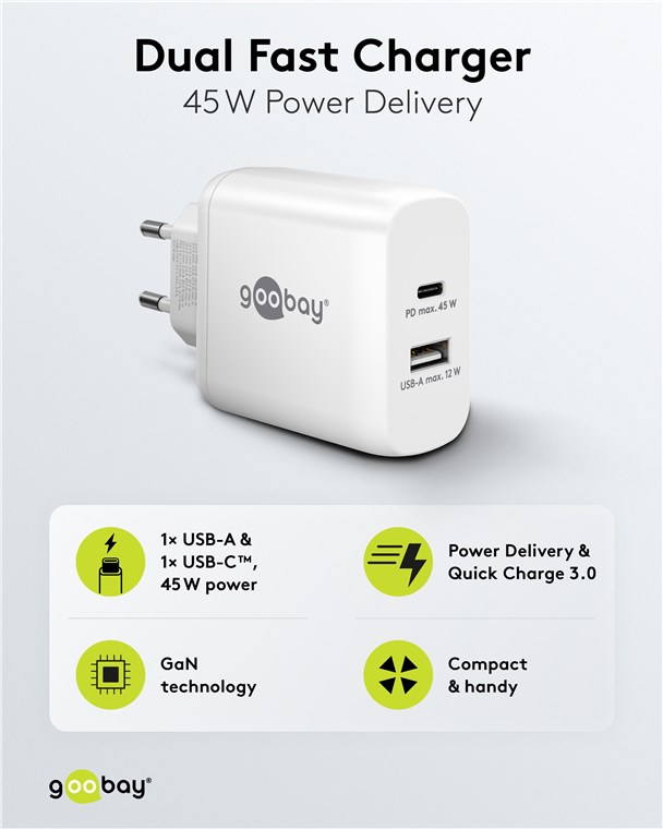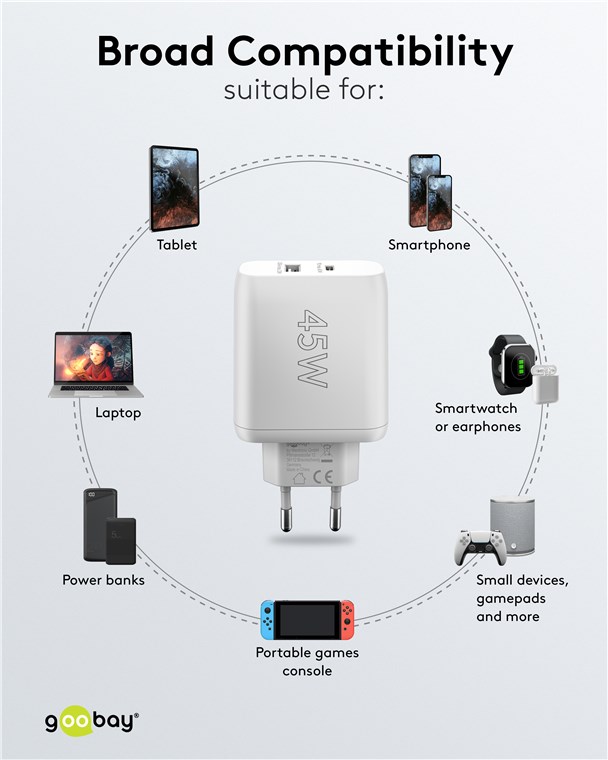• Avec une puissance de 45 W et des ports USB universels, le chargeur mural est adapté à pratiquement tous les appareils - du smartphone à l'ordinateur portable