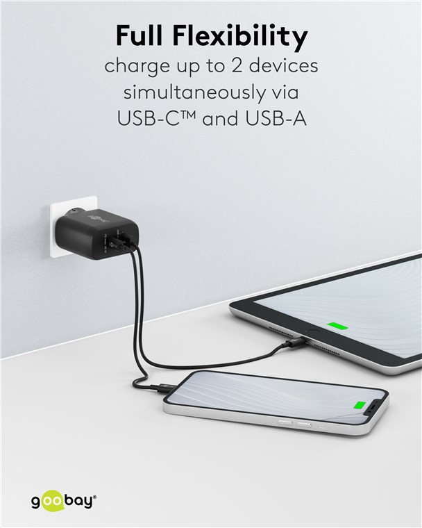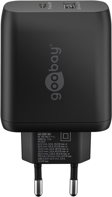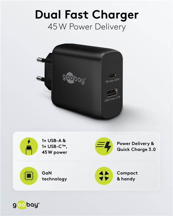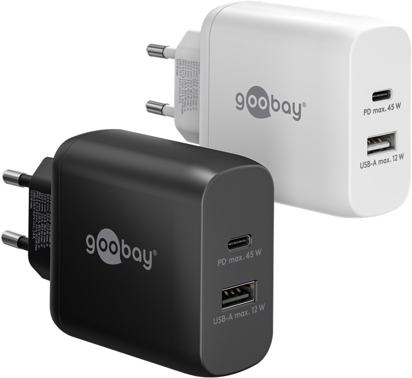 - Avec une puissance de 45 W et des ports USB universels, le chargeur mural est adapté à pratiquement tous les appareils - du smartphone à l'ordinateur portable