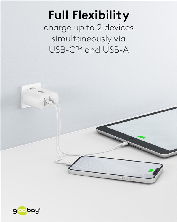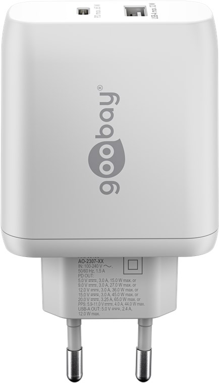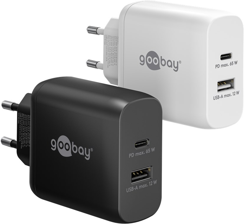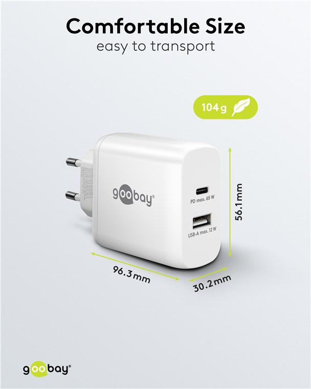 • Avec une puissance de 65 W et des ports USB universels, le chargeur mural est adapté à pratiquement tous les appareils - du smartphone à l'ordinateur portable haute performance