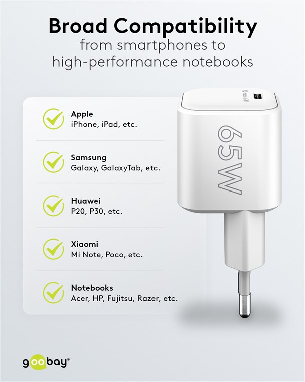 - Grâce à sa forte puissance de 65 W et au port universel USB-C™, l'adaptateur de charge convient à pratiquement tous les appareils - du smartphone à l'ordinateur portable haute performance