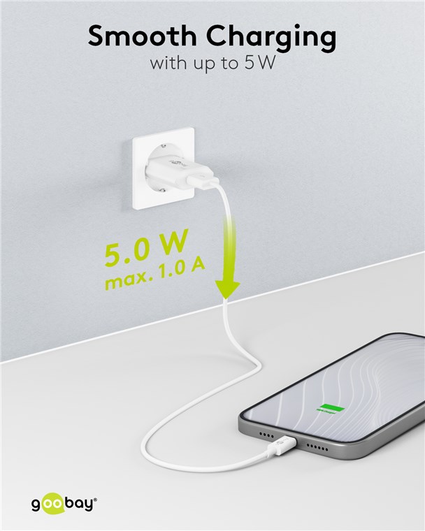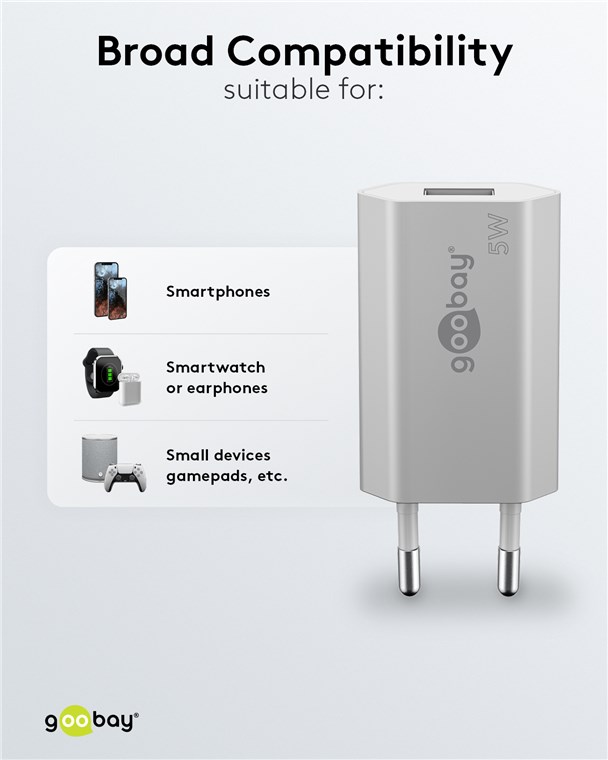 - Avec une puissance de 5 W, l'adaptateur de charge est spécialement conçu pour les petits appareils tels que les smartphones, les smartwatchs ou les écouteurs Bluetooth