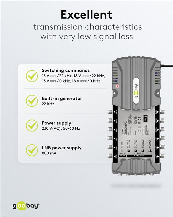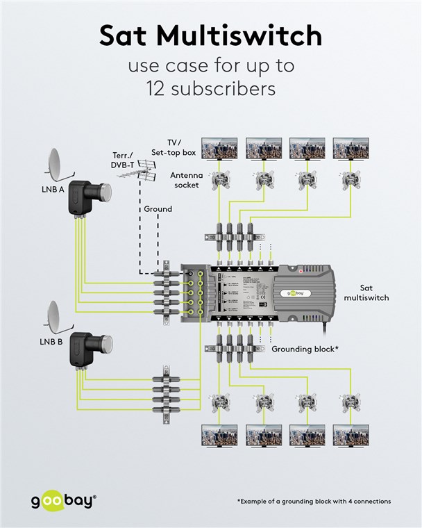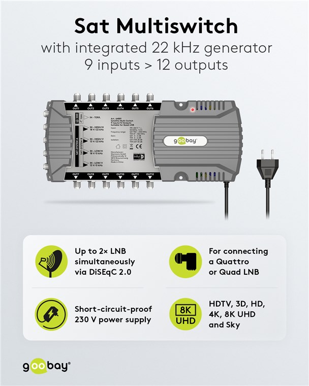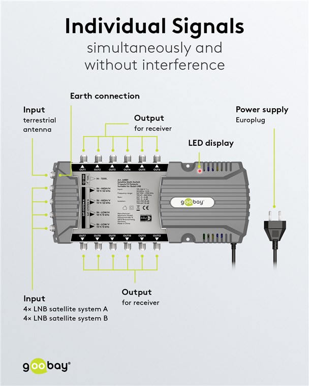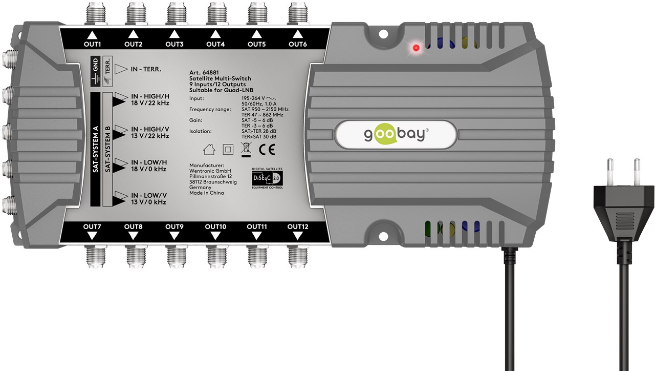 Le multiswitch est la solution pratique pour raccorder à une seule antenne parabolique plusieurs appareils pour la réception de la télévision et de la radio dans la même maison. Le commutateur veille à ce que chacun des 12 abonnés puisse profiter d'un programme individuel - pour une flexibilité maximale dans la réception de la télévision.