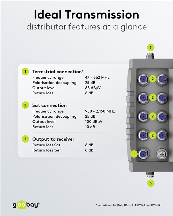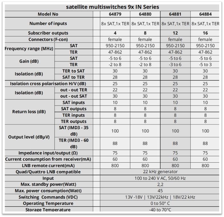 - Via DiSEqC 2.0, deux positions de satellites peuvent être commutées et réparties sur jusqu'à 12 abonnés, p. ex. sur des récepteurs satellite ou des téléviseurs avec un tuner satellite