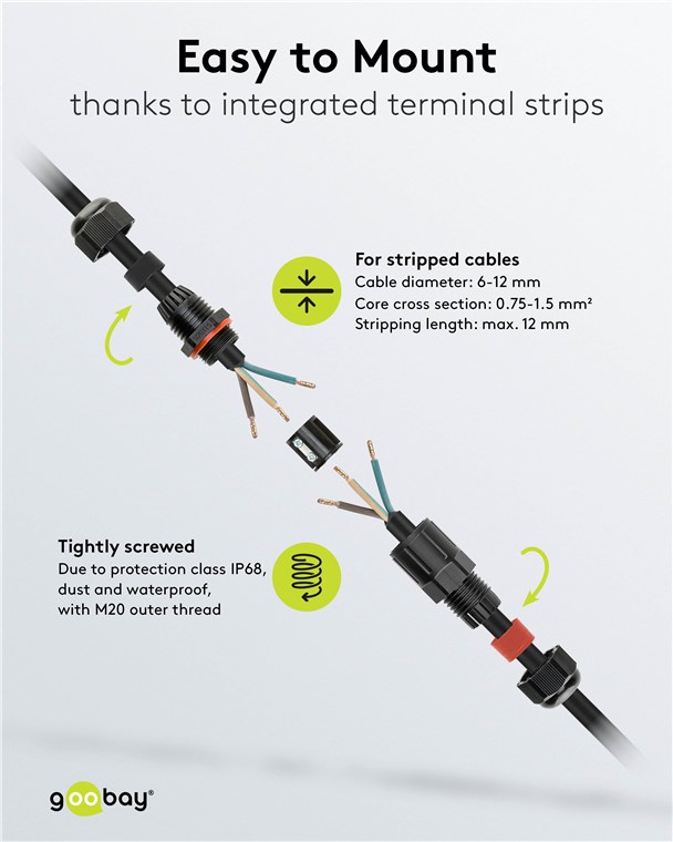- La boîte de jonction est adaptée aux câbles d'une section de conducteur de 0,75 à 1,5 mm² ou d'un diamètre extérieur de 6 à 12 mm