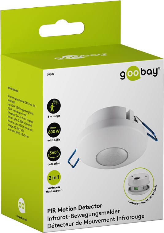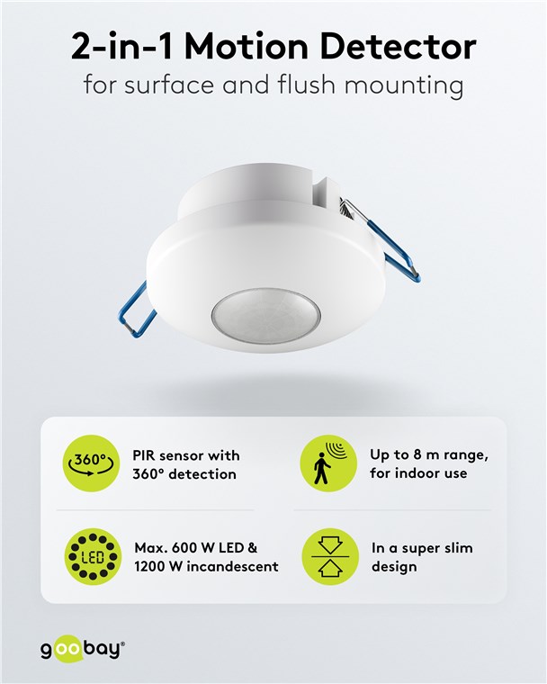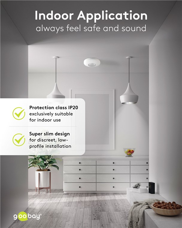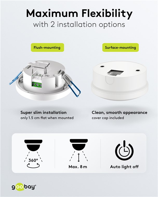 La flexibilité est reine : Le détecteur de mouvement dispose de deux clips pour un montage encastré sûr. Si nécessaire, les clips peuvent être retirés afin de transformer le détecteur de mouvement en une version apparente à l'aide du cache fourni. Avec ces deux options d'installation, il est parfait pour les couloirs, les salles de bains ou les entrées – le détecteur active toujours de manière fiable l'éclairage connecté.