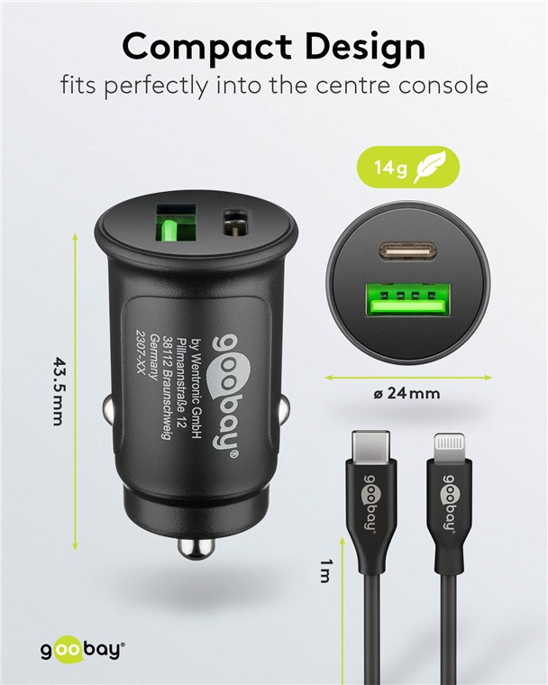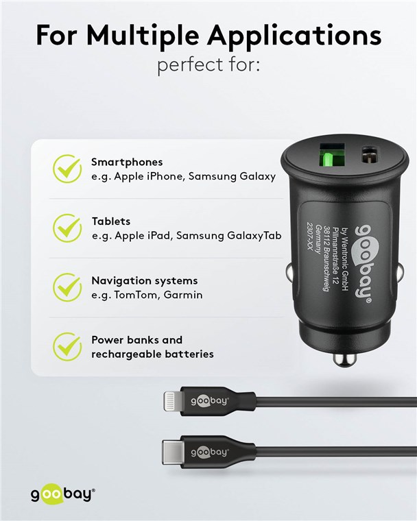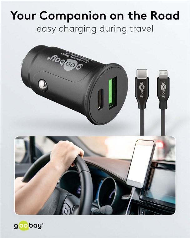 Le kit de recharge innovant de Goobay avec deux ports USB flexibles est la solution de recharge parfaite pour les navetteurs et les voyageurs, pour recharger leurs appareils ultra rapidement via l'allume-cigare - pour une sécurité énergétique totale. Le design discret et peu encombrant s'intègre élégamment dans tous les intérieurs et ne gêne pas la conduite.