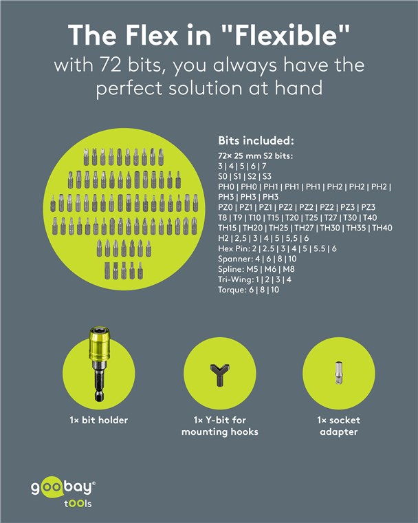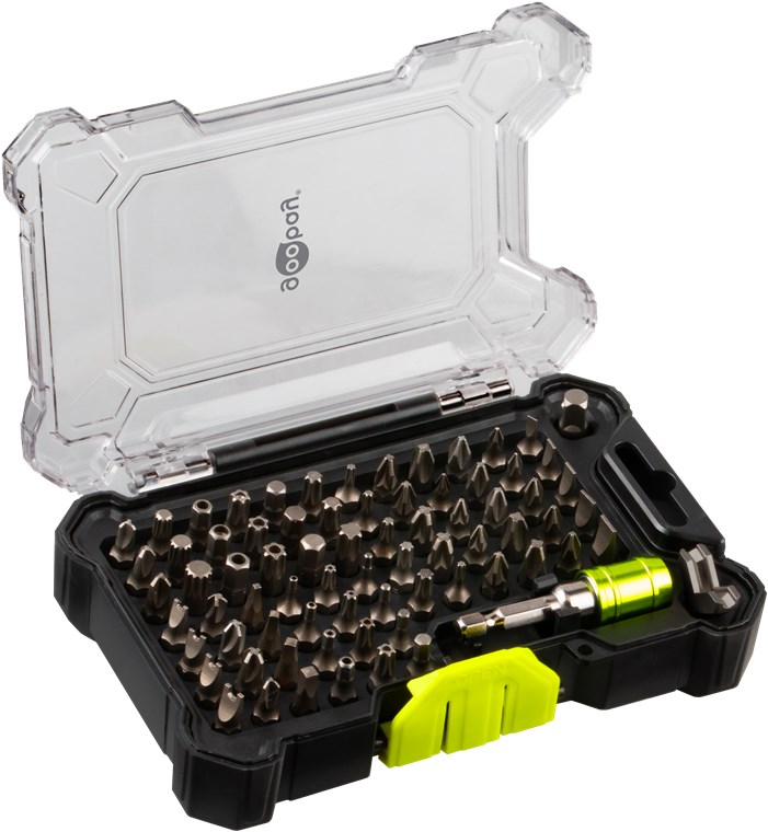 - Avec 1x adaptateur pour clé à douille, 72 embouts (CRV) : 5x fente, 19x cruciforme (PH, PZ), 4x carré, 16x étoile (T, TH), 7x hexagonal (H), 7x hex pin, 4x embout U, 3x spline, 4x Tri-Wing, 3x torque