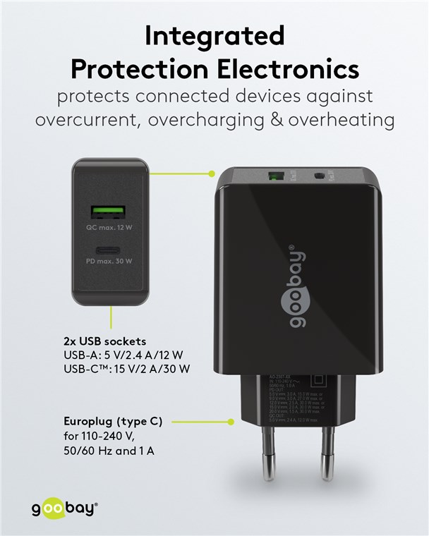 - L'électronique de protection intégrée des chargeurs USB-C™ protège les appareils connectés contre les surintensités, les surcharges et les surchauffes