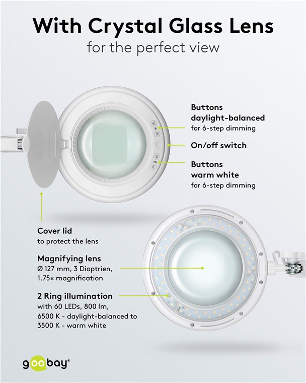 800 lm, luminosité & couleur de lumière réglables, lentille en verre 127 mm, grossissement 1,75 fois, 3 dioptries