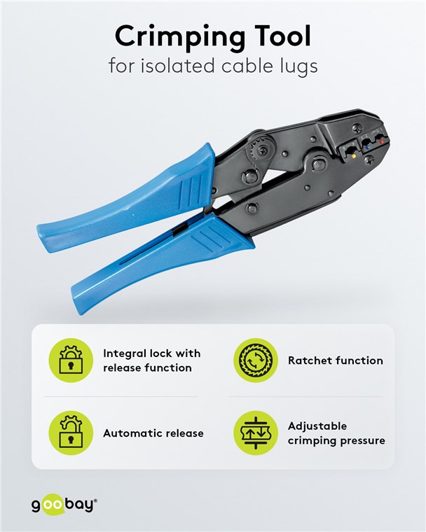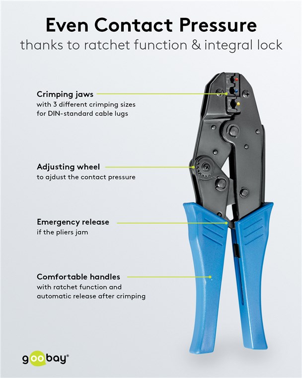 - Le blocage intégré empêche une ouverture trop précoce de la pince à cosse de câble, de sorte que seule une compression complète des poignées permet de l'ouvrir à nouveau