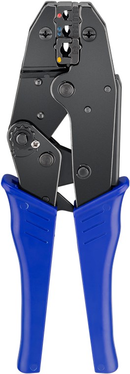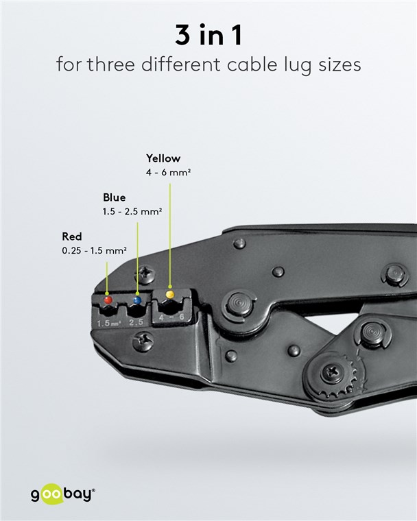 - Le code couleur pratique indique quelle mâchoire est adaptée à quelle taille de cosse : 0,5-1,5 mm² (rouge), 1,5-2,5 mm² (bleu), 4-6 mm² (jaune)