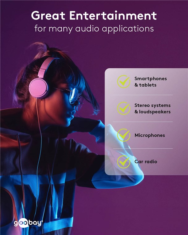 Goobay a toujours les bons accessoires électroniques pour vos applications audio, par exemple pour les studios d'enregistrement amateurs, les soirées home cinéma en famille ou les sessions musicales entre amis. Nos produits transmettent les signaux audio avec une qualité maximale pour une expérience sonore cristalline. La construction robuste et les matériaux de qualité de nos câbles de connexion, adaptateurs, convertisseurs et connecteurs audio garantissent un divertissement sonore. Simplement. Tout. Ce qu'il vous faut!