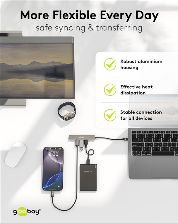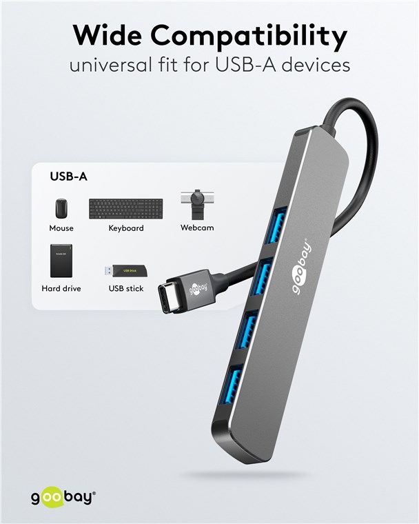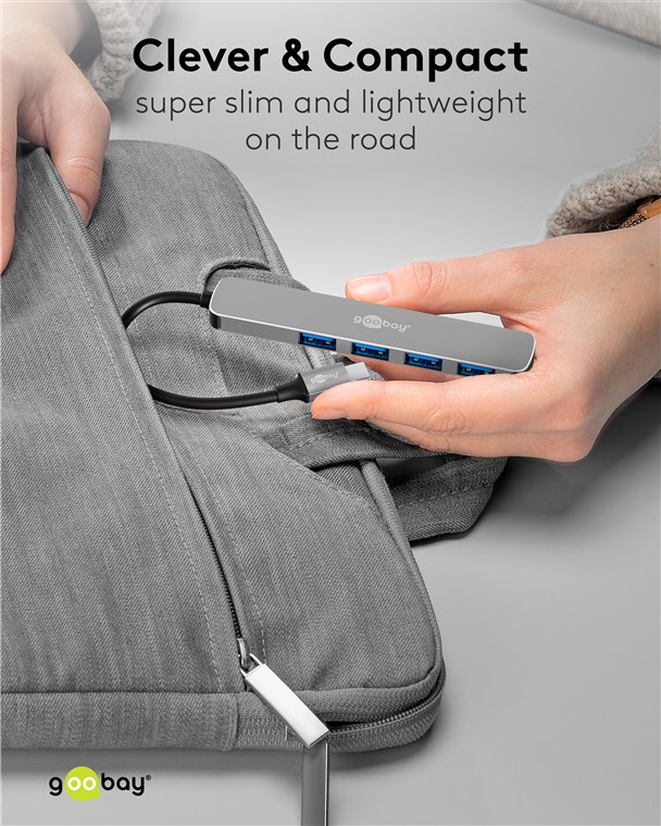 Connectivité maximale pour chaque tablette, smartphone ou ordinateur portable via un seul port USB-C™ : Le Hub slim multiplie les connexions pour tous les appareils USB-A tout en offrant des débits de données SuperSpeed de 5 Gbit/s. Plus jamais de changement fastidieux de prise ou de ports insuffisants – l'adaptateur multiport pratique est parfaitement équipé pour relever tous les défis numériques.