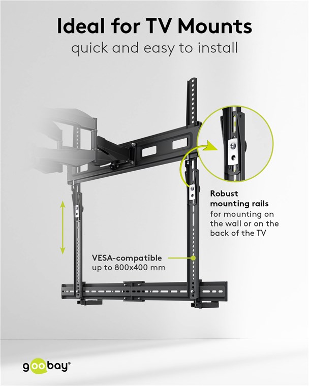 - Le rail de support robuste peut être vissé au mur ou fixé directement à l'arrière du téléviseur (compatible avec les normes VESA jusqu'à 800x400 mm)
