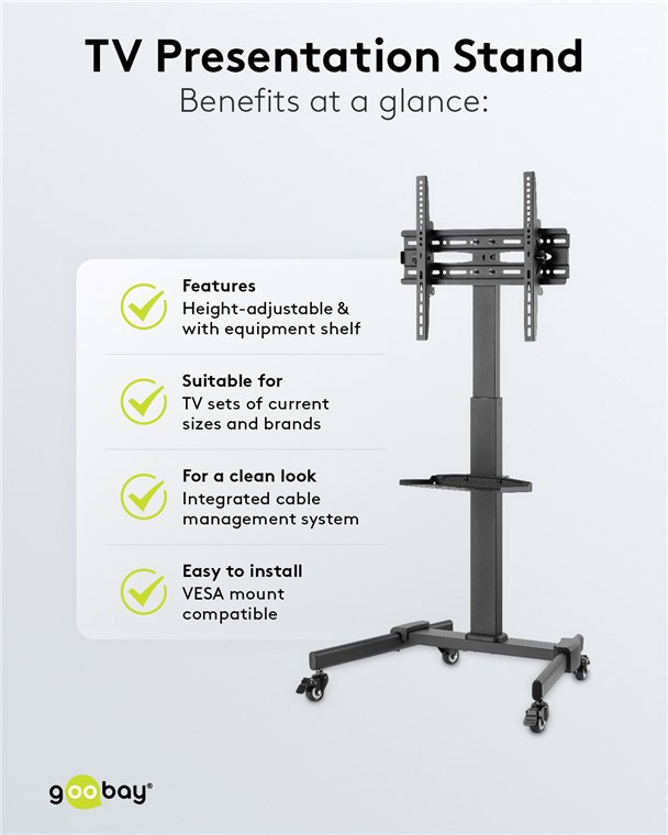 Une mobilité totale pour ton contenu : Grâce à ses roulettes, le support TV est le choix idéal pour une utilisation mobile lors de conférences, dans les salles de cours et les espaces d'accueil. Place tes présentations ou écrans d'information là où ils seront vus. Le support télescopique, le support inclinable et les 8 niveaux de hauteur différents garantissent un angle de vue parfait partout.