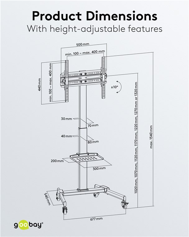 • Avec 8 niveaux de hauteur pour le téléviseur, qui s'enclenchent facilement grâce à un système à clic (téléviseur inclinable de -10/+10°)